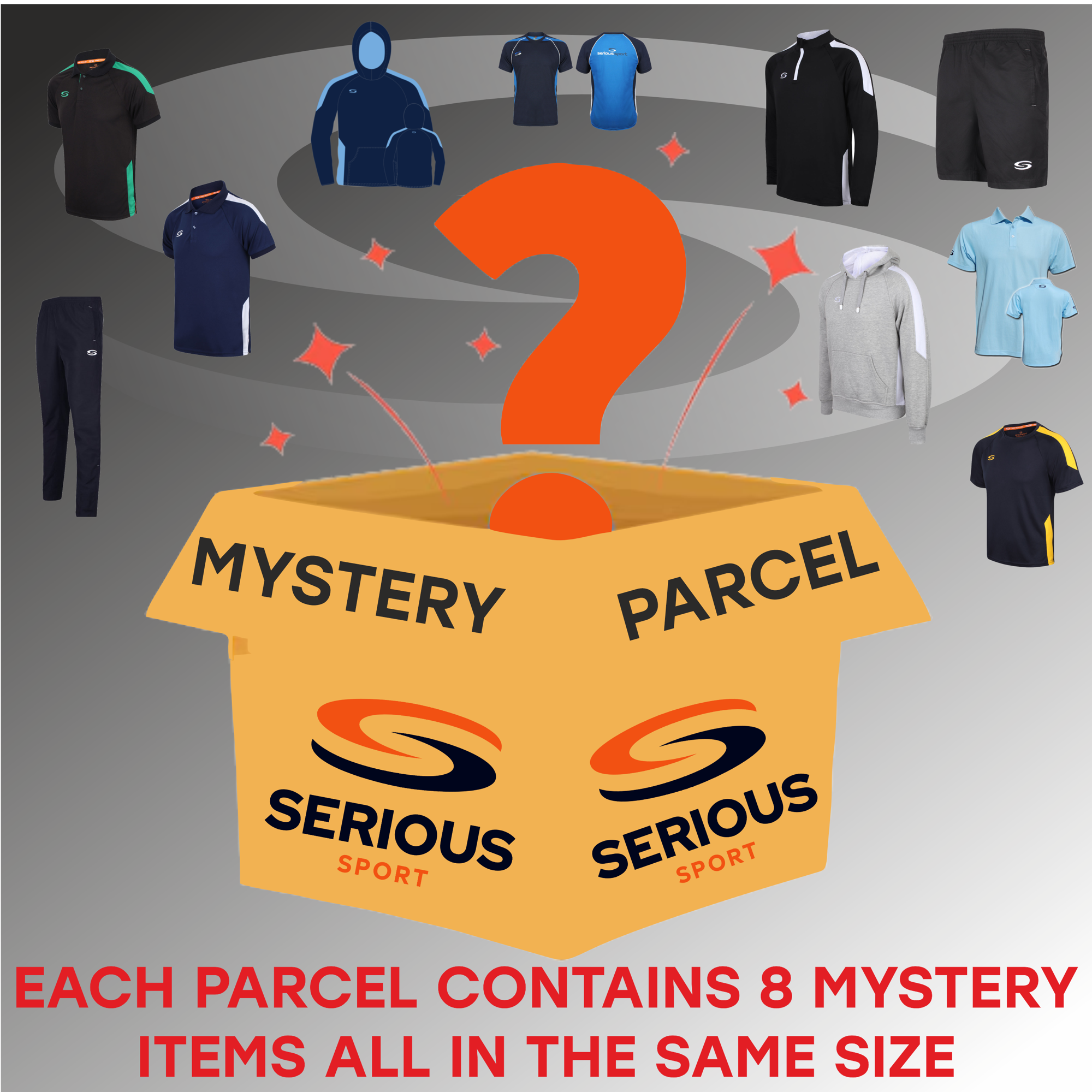 This Mystery Parcel comes packed full of surprises! A random selection of 8 products for an incredible price. From t-shirts to polos, to hoodies shorts and tracksuit bottoms , the contents are a surprise each time you order!