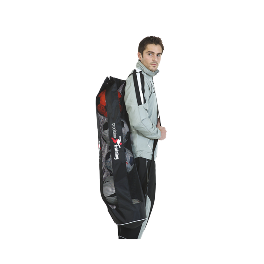 Holds up to 5 fully inflated size 5 balls and has shoulder strap and drawcord closure.