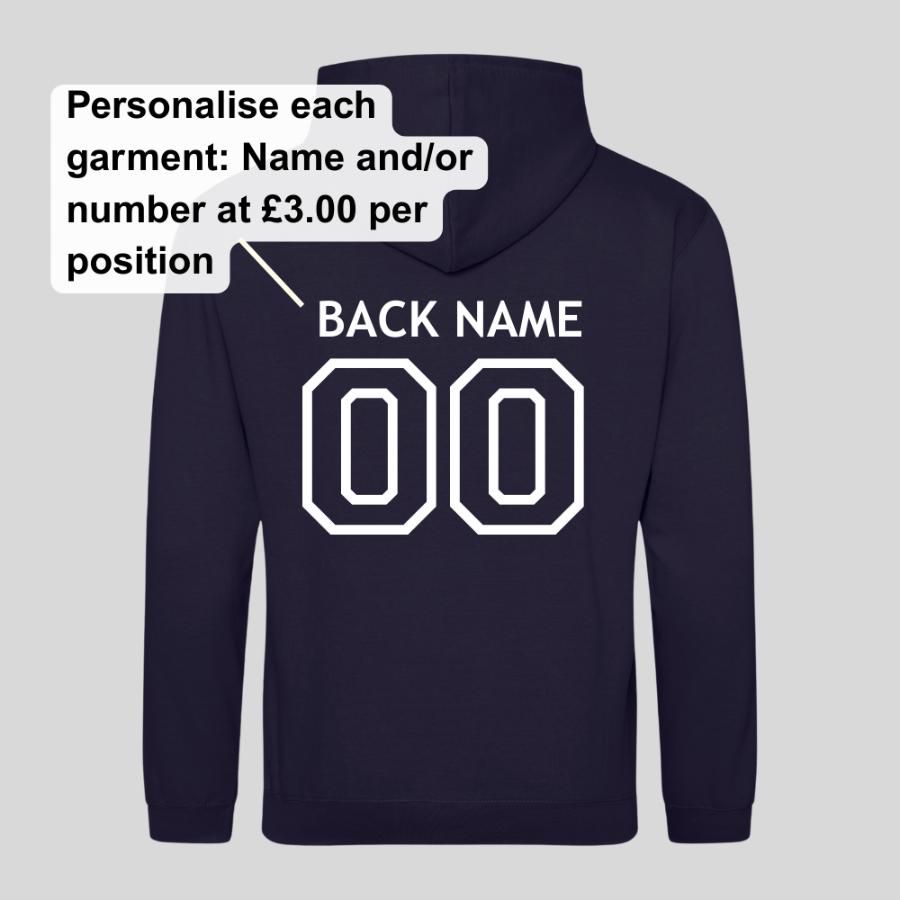 Personalise each garment: £1.50 per line underneath the logo or name (£3.00), and number (£3.00).