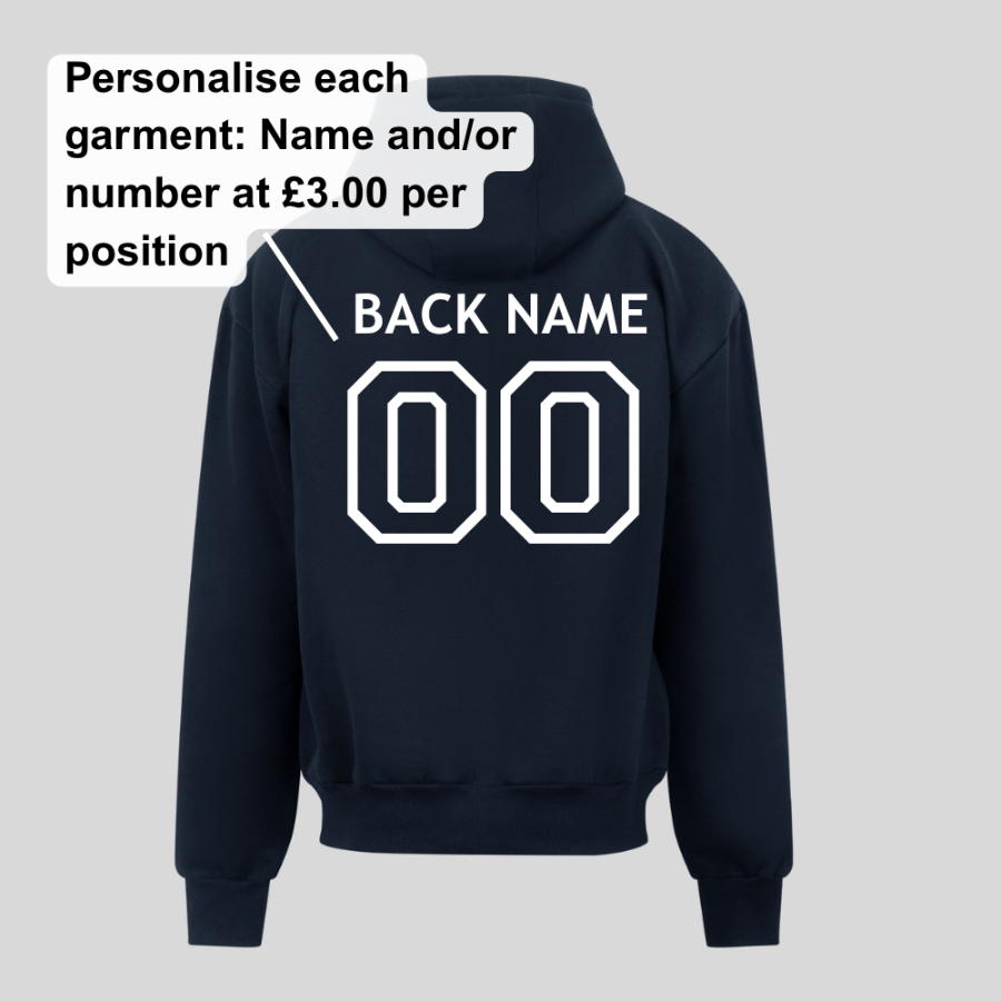 Personalise each garment: £1.50 per line underneath the logo or name (£3.00), and number (£3.00).